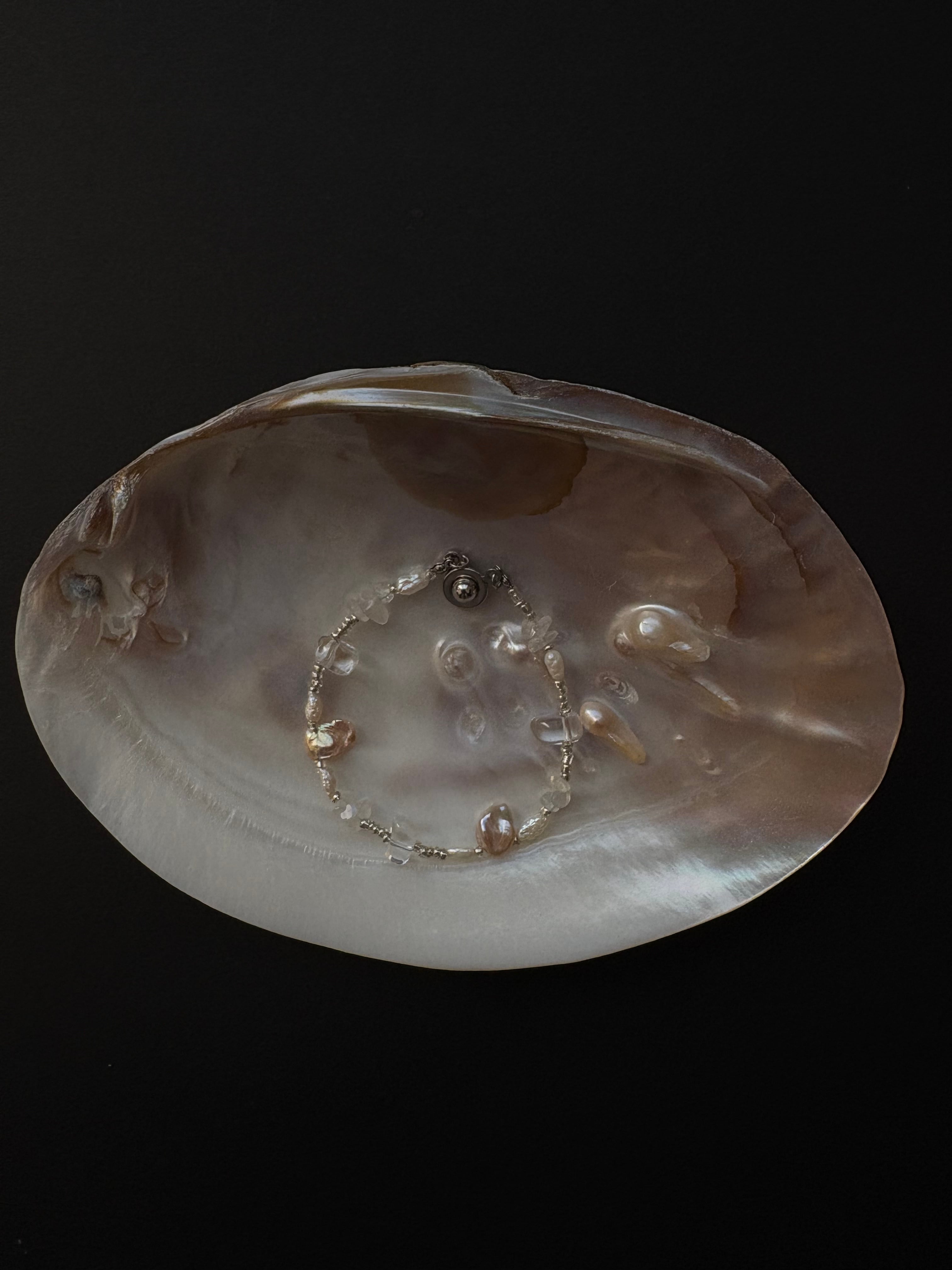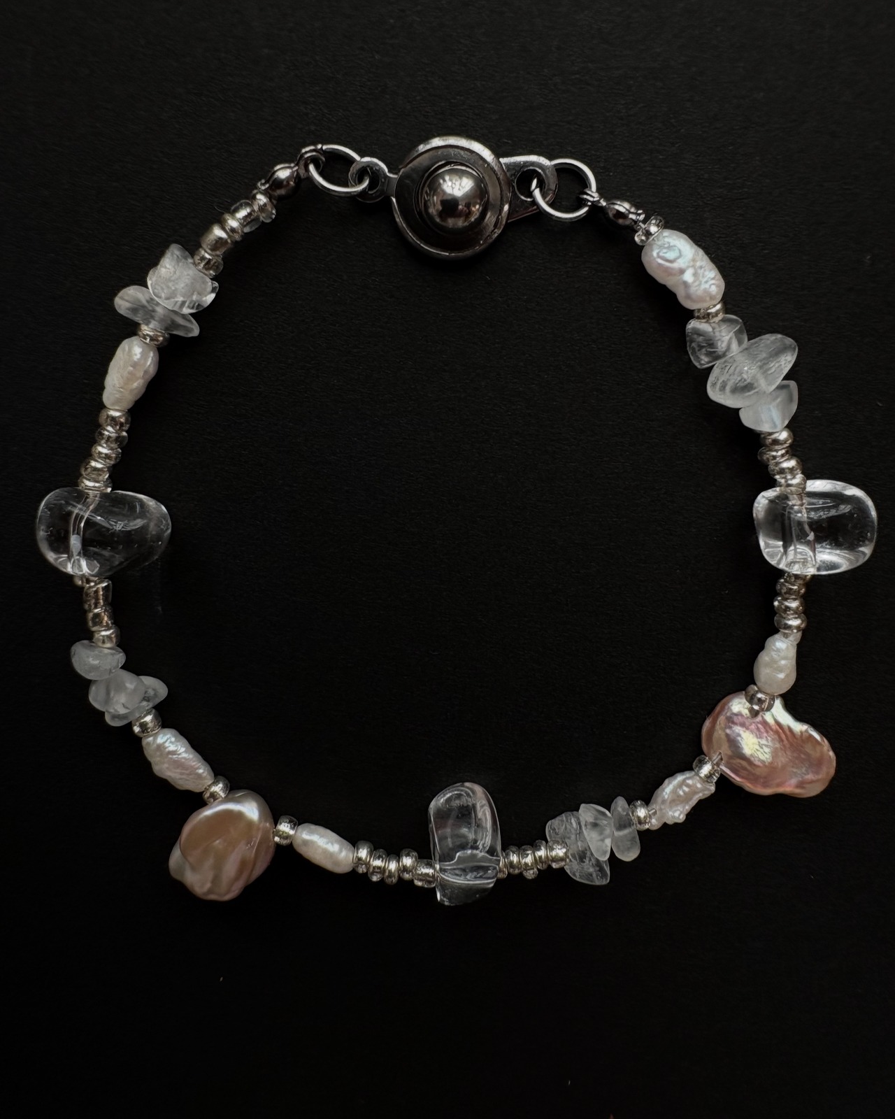 月の光を感じさせる神秘的なブルームーンストーン、純粋な美しさを象徴するパール、そして透明感溢れる水晶が絶妙に調和したブレスレットです。